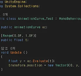 AnimationCurve 썸네일형 리스트형 AnimationCurve 클래스를 이용하여 간단 애니메이션 만들기 이번에는 AnimationCurve 클래스를 이용해서 간단한 애니메이션을 만들어보겠습니다.간단하게 좌표이동만..... C#스크립트 하나를 만들어 주시고 위 이미지처럼 스크립트를 작성해 주세요. 간단하죠? 그리고 씬에 오브젝트 하나를 만들어 주고 이 스크립트를 연결해줍니다.저는 Sphere 하나를 만들겠습니다. 그럼 Inspector View에 위 이미지처럼 나올텐데요, 제가 빨간 박스 친 부분에 회색 영역이 생겼습니다.저 부분을 클릭 해 보면...... 위와 같이 Curve 에디터가 나타나고 Curve를 설정할 수 있습니다.아래 박스친 부분은 미리 설정된 Curve이고 저는 두번째 설정된 것을 눌렀습니다. 그래서 우상단으로 올라가는 선이 생겼죠.포인트를 직접 추가해서 Curve를 생성 할 수도 있습니다... 더보기 이전 1 다음